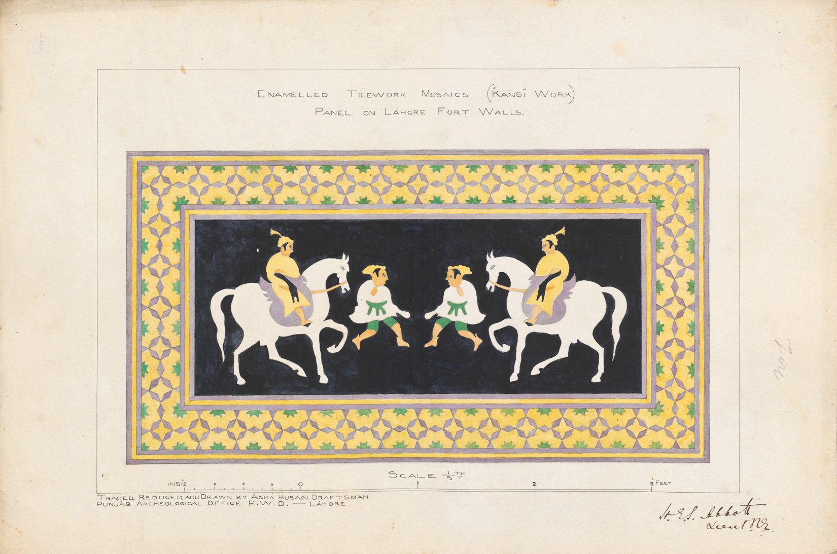 Jahangir (31 August 1569 – 28 October 1627) made significant additions to the Lahore Fort, including the Kala Burj pavilion, which exhibits European influences with its vaulted ceiling and Christian paintings of Madonna and Jesus. Another example of European influence can be seen in the “Picture Wall” he built, displaying numerous glazed tiles with paintings, similar to the Portuguese style of decorating churches with ceramic tiles during that era. The picture wall serves as a valuable source of insights into the daily activities, sports, hunting, and leisure pursuits of the Mughal courts, including a panel depicting four horses playing a Mongolian game known as Polo in modern times.